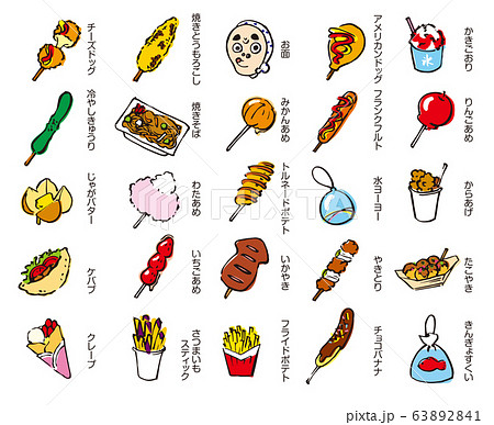 【手描きベクター食べ物イラスト素材】縁日・お祭り・屋台の食べ物セット