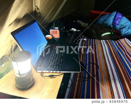 スマホに充電中のポータブル電源とソーラーパネルとライト