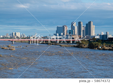 日本の東京都市景観 台風一夜明け。増水・泥水の多摩川。右奥に武蔵小杉=13日午後