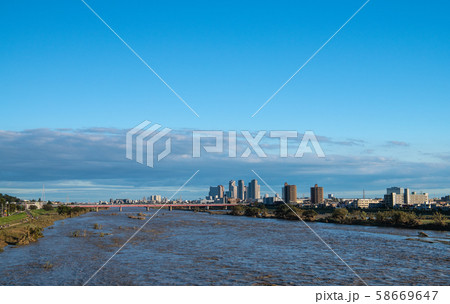 日本の東京都市景観 二子玉川から 増水・泥水の多摩川を望む。(画面奥は川崎側)=13日夕