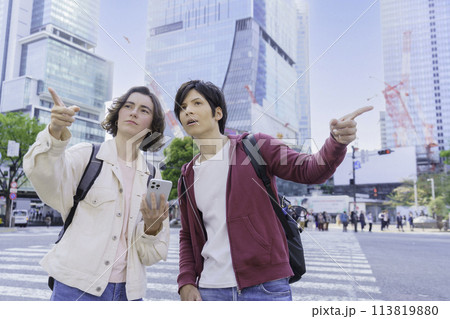 インバウンド 渋谷でスマホを手に会話する外国人カップル