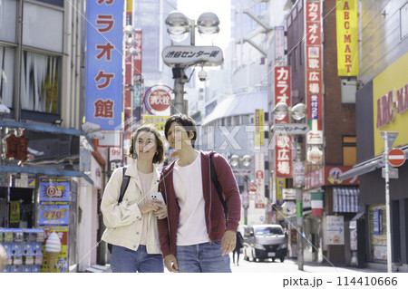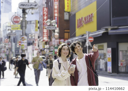 インバウンド スマホを手に秋葉原を散策する外国人旅行者カップル