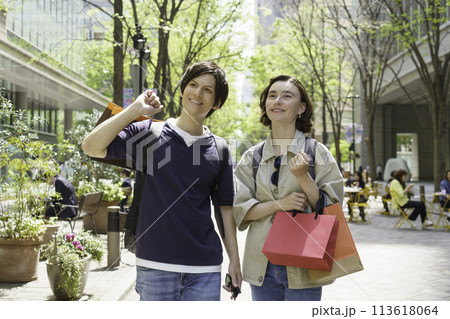 インバウンド 銀座でショッピングをする外国人旅行者カップル 縦位置