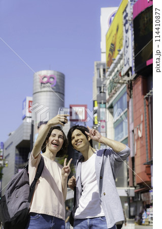 インバウンド 渋谷センター街で自撮りをする外国人カップル 縦位置
