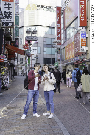 インバウンド 渋谷の街を観光する外国人カップル 縦位置