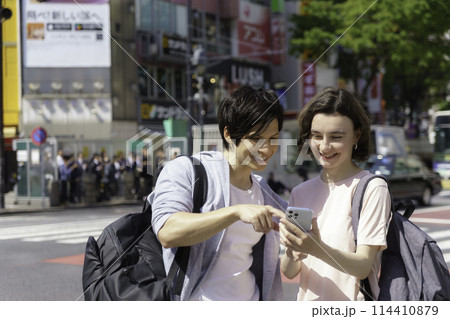 インバウンド 渋谷の街をスマホを見ながら観光する外国人カップル