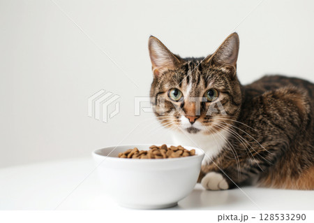 cat sitting near the white bowl of pet food. isolated background .bowl for mockup. Generative AI