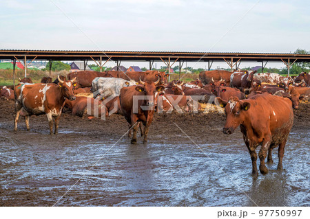 Red and white cows in a feedlot. Cattle farm