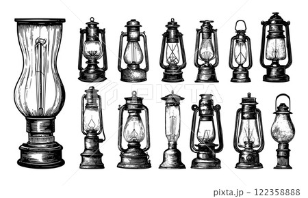 Barn old lamps engraving vector set. Lantern retro lightings with fuel mantle gas kerosene light bulbs, grayscale hand drawn ink sketch isolated vectors on white background