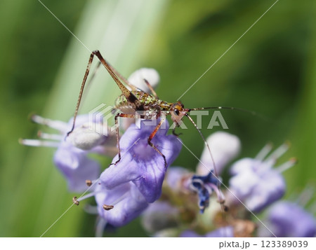 霧ヶ峰高原で見られる夏の生き物。シシウドの花にツユムシがとまり、草原の中で自然の営みを感じさせます。
