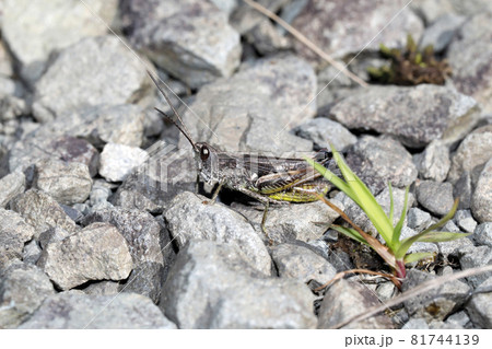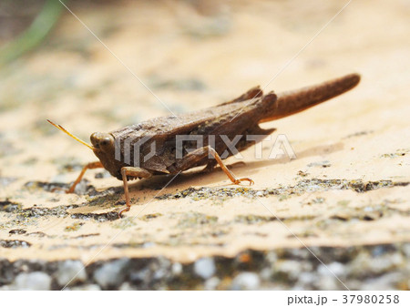 成虫越冬した黄褐色のバッタ科ツチイナゴ