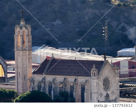 Historic Stone Church With Bell Tower Scene, Old Gothic Church Overlooking Railway And Mountains