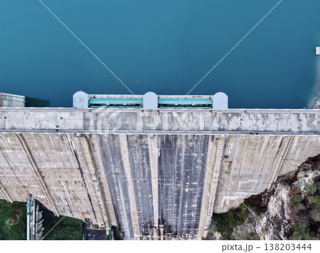 Concrete structure over tranquil lake, Elevated perspective revealing spillways and serene turquoise waters