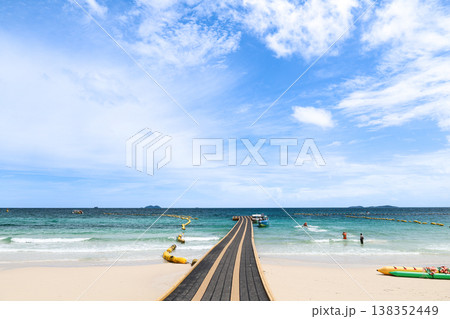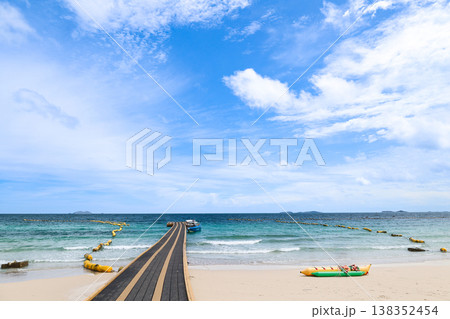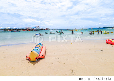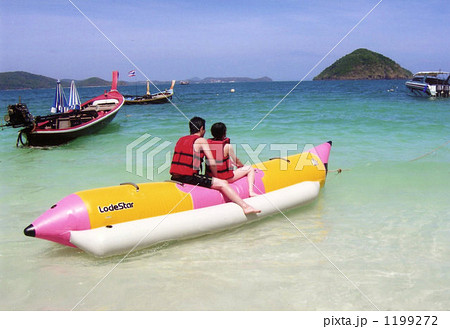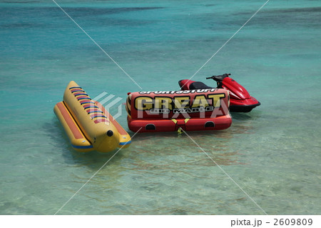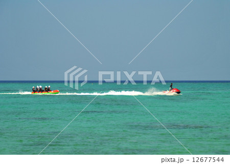 ビーチリゾート|青い海とバナナボートに乗って遊ぶ観光客の写真