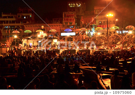 裕福な信者は陸上で、他は船で鑑賞するバナーラスのプージャ