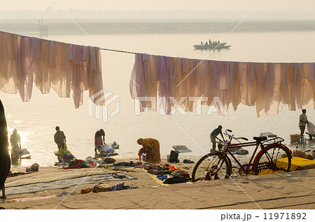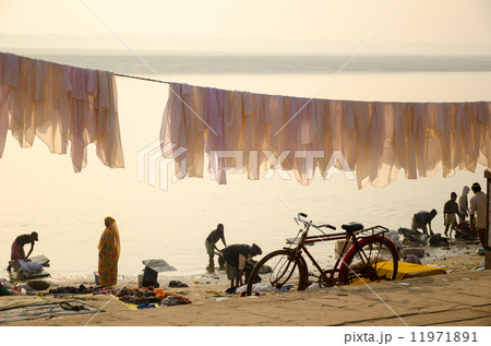 インド 朝のバナーラスの洗濯の情景1 バラナシ 洗濯