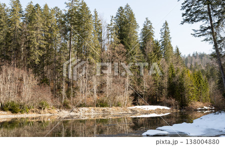 Calm forest water and melting snow in late winter, Bavaria, Germany
