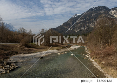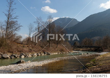 Clear river bending through alpine valley in late winter, Bavaria, Germany