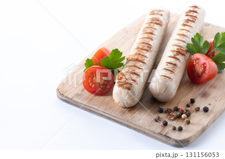 Grilled white sausages with cherry tomatoes and parsley