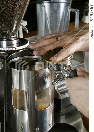 Barista leveling ground coffee in the portafilter.