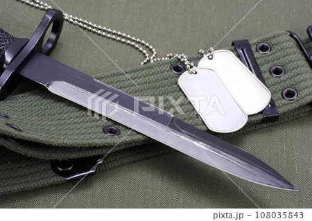 bayonet and dog tags on US ARMY uniform