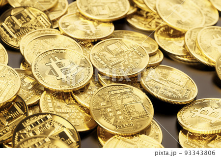 テーブルの上に散らばった仮想通貨のコイン / 3Dレンダリンググラフィックス