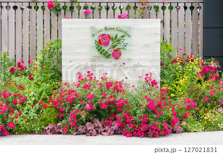 あやせローズガーデン(綾瀬市 光綾公園)のバラの咲き乱れる入り口の看板。2025年5月リニューアル