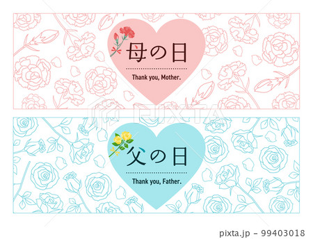 母の日、父の日のバナーセット 3:1サイズ / 赤、青色背景 / カーネーション、バラ、フレーム