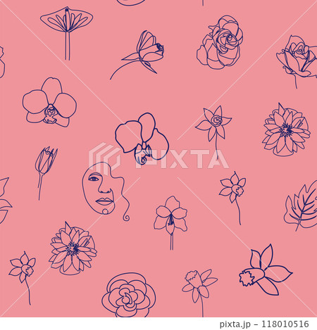 Woman face Continuous line seamless pattern. Abstract Female portrait with flowers. Drawing vector Wallpaper