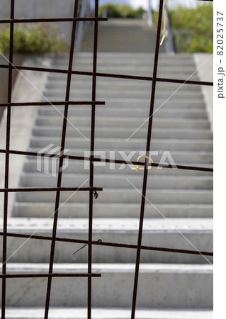 整備中の工事現場に設置された錆びたメッシュフェンス