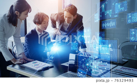 オフィスを歩くビジネスグループとデジタルデータ