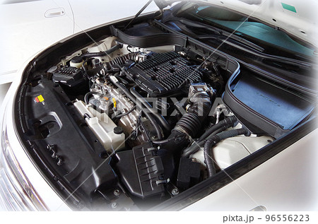 V型6気筒ガソリンエンジンを搭載した乗用車のエンジンルーム(イラスト風)