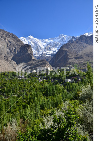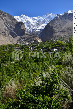 パキスタン 快晴の朝のフンザ カリマバード中心部の美しい山と村と新緑