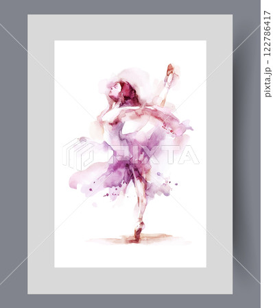 Woman ballerina dances in ballet theater and raises leg up, on wall art. Watercolor artwork