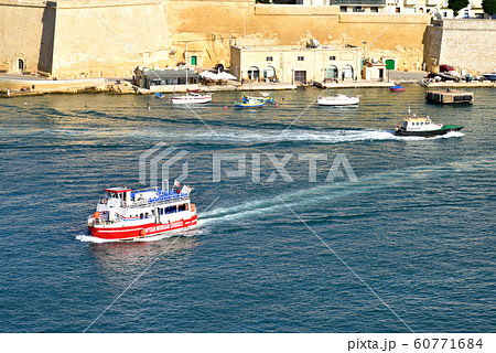地中海 マルタ共和国 バレッタ港風景 赤い小型船舶 城砦都市バレッタ