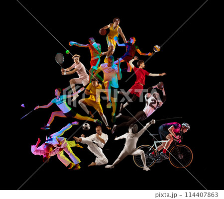 Vivid sport collage. Athletes in tennis, basketball, volleyball, cycling, fencing, and martial arts against black background.