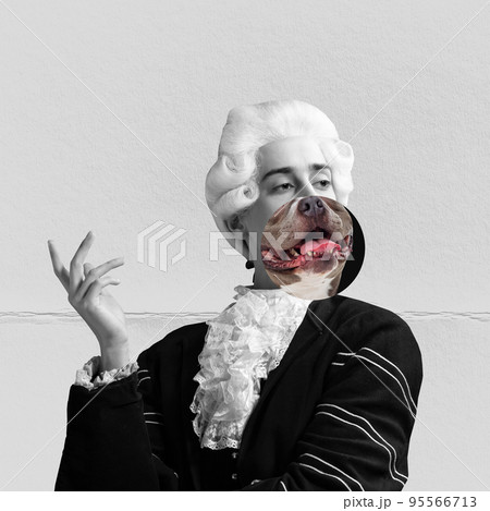Young man in white wig in image of medieval royal person with dog's face instead face. Comparison of eras concept. Contemporary surreal art portrait