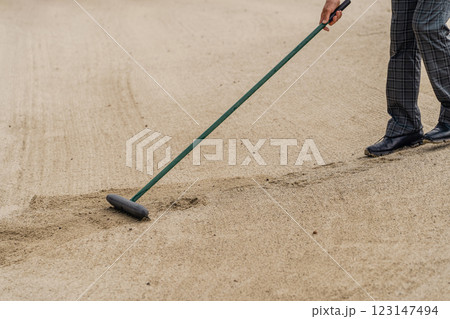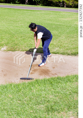 ゴルフコースのバンカーをレーキでならす男性ゴルファー