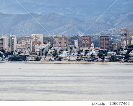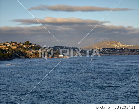Serene shoreline with distant hills, Peaceful seaside area featuring gentle hills and buildings