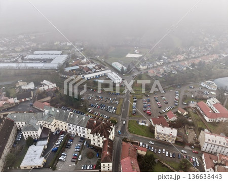 Overcast Sky Covers Quiet Neighborhood, Hazy Suburb Scene With Industrial Zones And Vacant Parking Areas