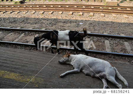 バングラデシュの首都のダッカ コムラプール駅の線路を歩く山羊とプラットホームで昼寝をする野良犬