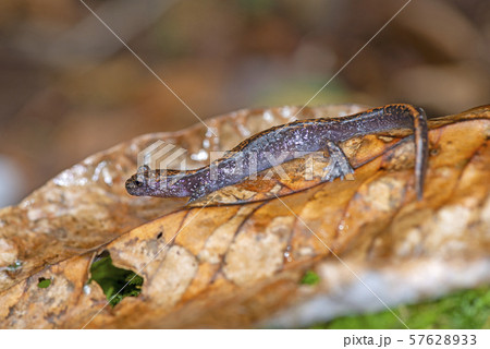落葉の上を歩くバンダイハコネサンショウウオ 雌