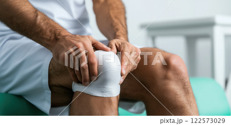 Man putting knee brace to support painful leg. Athlete bodybuilder leg wearing knee support brace or elastic kneecap bandage. Sleeve for compression. Health problems and pain.