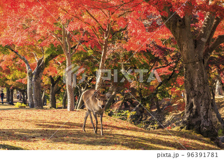 奈良県奈良市の奈良公園の紅葉の落ち葉の上に座る鹿