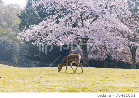 奈良公園の芝生に休憩している鹿 桜が満開の季節