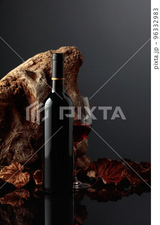 Bottle of wine and glass of wine, grapes on grey orange background.