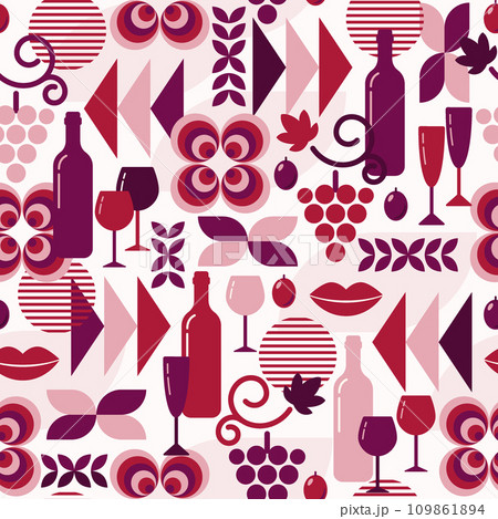 Red wine theme background with design elements in simple geometric style. Seamless pattern with abstract shapes. Good for branding, decoration of wine package, cover design, decorative print
