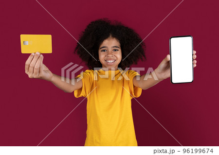 Adorable curly black girl showing cell phone and credit card