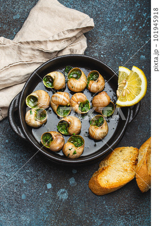 Escargots de Bourgogne Snails with Garlic Butter and Parsley in black cast iron pan with Lemon and Toasted Baguette Slices on rustic stone background top view, traditional French Delicacy .