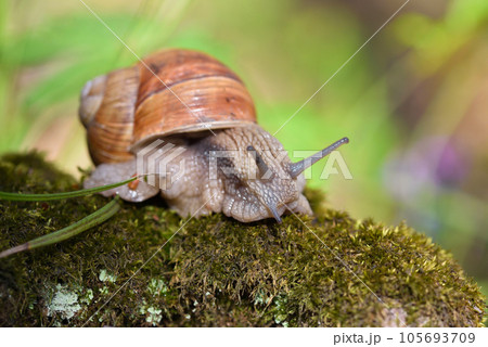Burgundy snail (Helix pomatia, Roman snail, edible snail, escargot) on the moss. Close-up images